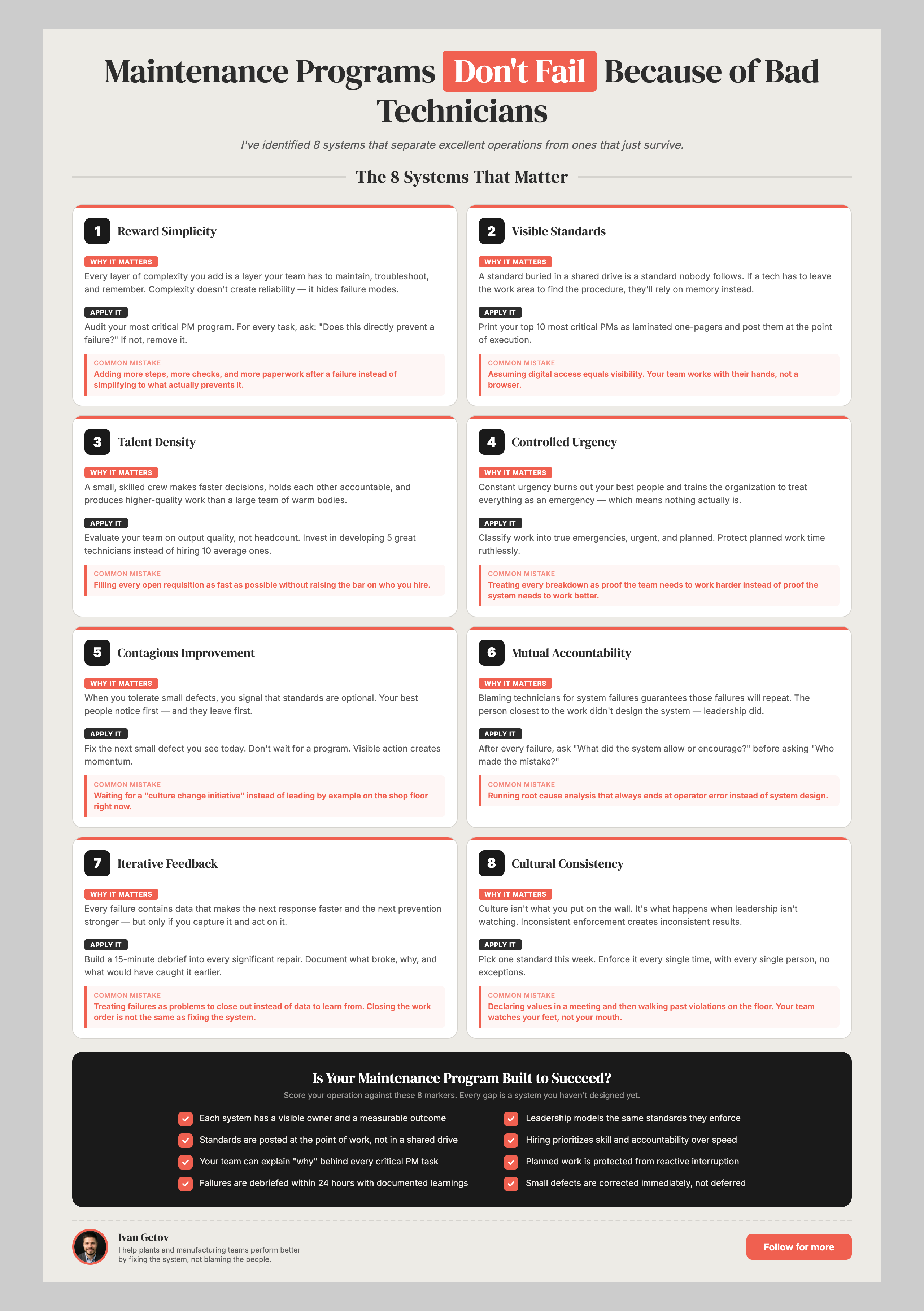 When a maintenance program fails, the autopsy always points inward: 'your PMs aren't running,' 'your techs aren't closing work orders,' 'your compliance is low.' But the root cause almost never lives inside the maintenance department. Programs fail at the boundary — the production handoff that didn't happen, the part that arrived the week after the shutdown, the KPI that nobody outside maintenance ever looks at. This infographic names the five boundary failures that collapse maintenance programs and the governance patterns that hold them.